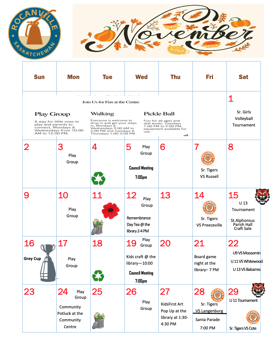 The Rocanville community calendar is published at the beginning of every month. It includes information pertaining to Rocanville's recreation facilities, services offered, items for sale and so much more!