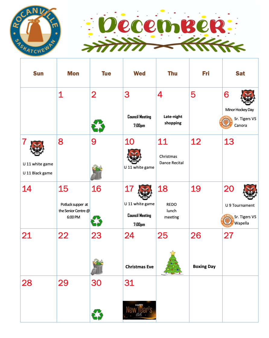 The Rocanville community calendar is published at the beginning of every month. It includes information pertaining to Rocanville's recreation facilities, services offered, items for sale and so much more!